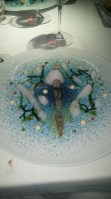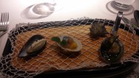 Comenzó la sucesión de entrantes, supuestas concentrados de cocina tradicional marinera cuyo objetivo es captar esa fusión de texturas, formas de cocinado y sabores antagónicos unas veces y complementarios otras, y eso lo intenta el afamado restaurador mediante la sopa servida en un tubo de ensayo, mejillón y otros moluscos rellenos con texturas de cremas y espumas de mar depositadas sobre un plato-barco o pa amb tomaquet deconstruido en forma de migas y superado por un trozo infinitesimal de sardina.A continuación nos sorprendieron composiciones marinas de platos en versión reducida: Crema de cigalas que inundaba (mediante su adición) un arrecife de quinoa, cuadro abstracto de diferentes salsas dispuestas a modo de trazos de pincel con un langostino crudo (aunque supuestamente marinado) en el centro, platos variados con nombres intercalados en inglés y componentes orientales desconocidos. Algunos con fuerte olor a mar e imposible sabor comestible. Otros, interesantes por su sencillez y de sabor apreciado y los más inquietantes por la supuesta contribución de componentes, salsas y sabores que contraponían el principal y cuya aportación se hacía mediante un punto de 1 mm de diámetro.
