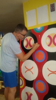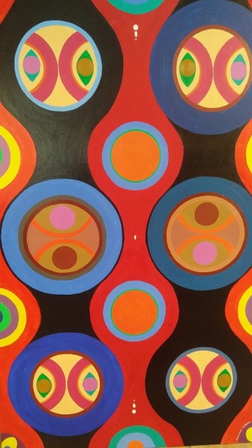 Una vez terminado el proceso de pintado al óleo, que llevó casi doce meses, decido los realces, pequeños detalles como los diseños en blanco sobre el flow rojo o los aros azul celeste que rodean los círculos centrales naranjas, que dotaran de suficiente contraste a la creación.