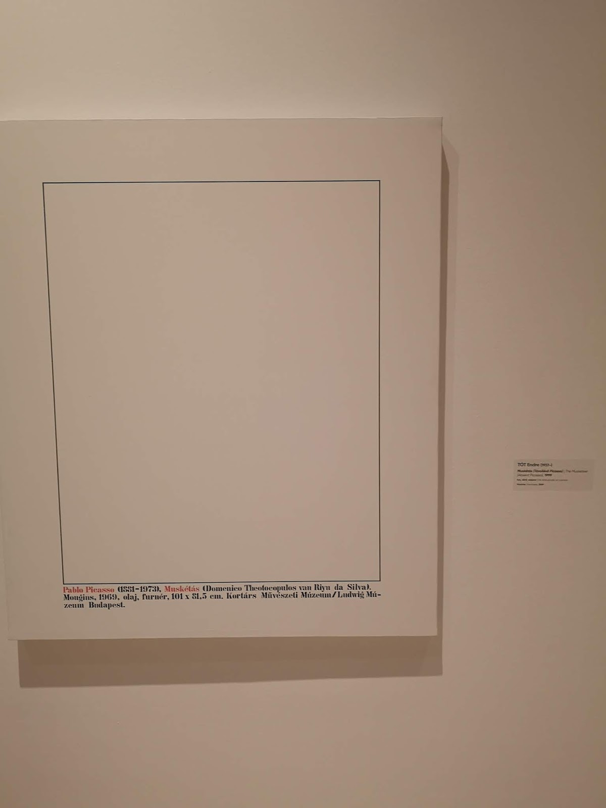 Y como ejemplo, esta obra de Endre Tót, artista húngaro que expone esta obra inspirada en Picasso y que no deja de ser un cuadro blanco con rectángulo negro en él. Una bobada de obra que encierra, sin embargo, mucho mensaje.