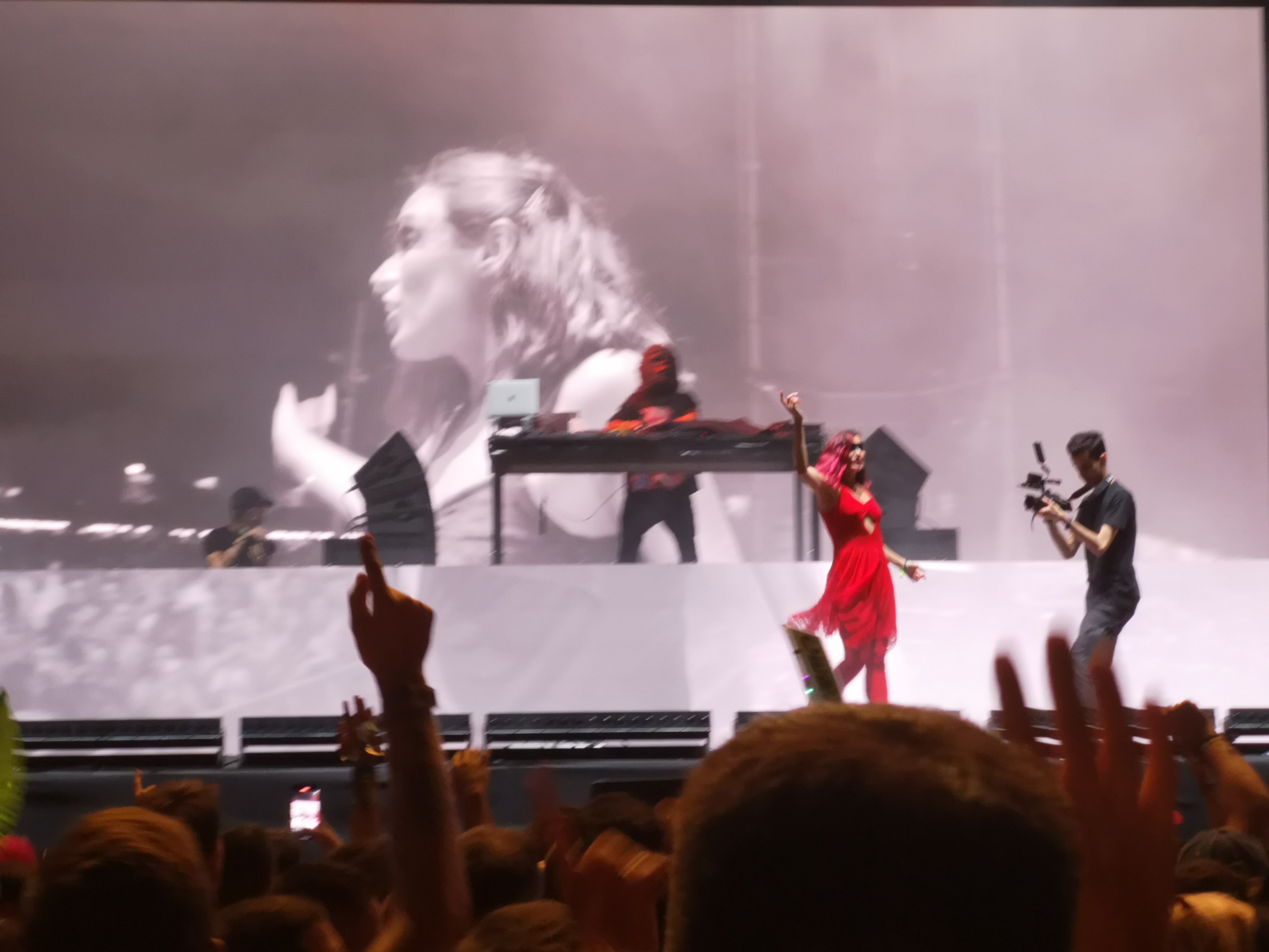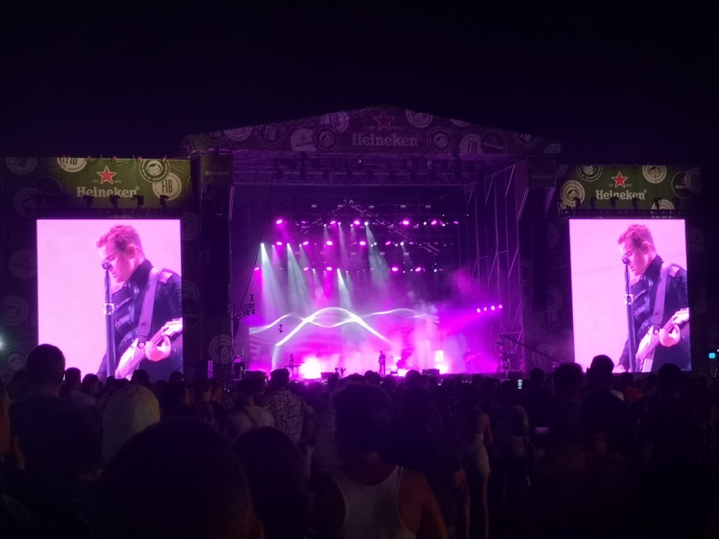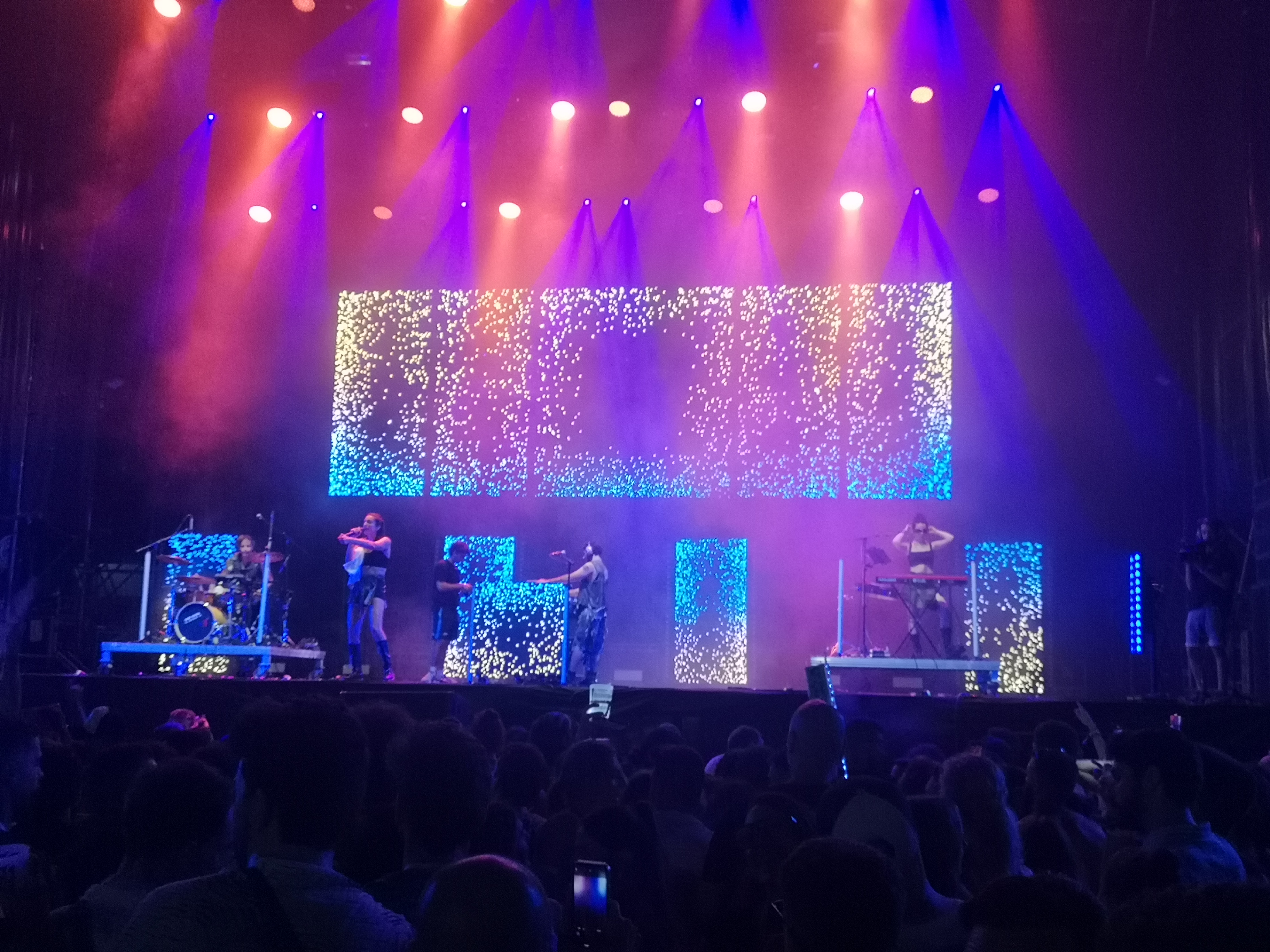Segundo día, plato fuerte ELYELLA, grupo que descubrí en el anterior FIB y que me dejó impactado. Vuelven a demoler al público con su brutal concierto. Espectaculares. Brincando y saltando, olvidando que las rodillas a los cincuenta luego se resienten, pero ya lo pensaré mañana. Hora y cuarto de electrónica y temas sumamente pegadizos que cantamos y tarareamos, porque nos los sabemos, sí, a pesar de estar en otra década, jajaja. Tremendo el concierto. Acabamos agotados y doy mentalmente mi 10 de nuevo a este dúo. Nos vamos al escenario grande a La La Love You, grupo del que mi referencia conceptual es el pop colorista. Llegamos, media explanada llena, la mayoría de las canciones no las conocemos y tampoco nos enganchan, contrariamente a lo que yo esperaba. Intentamos bailar un poco, tararear, nos vemos cansados. Abandonamos.