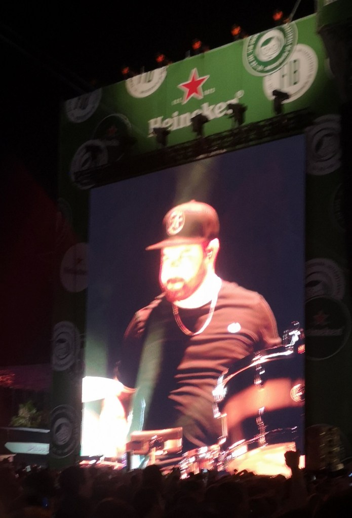 Tercer día, con generación Z a mi lado nos dirigimos al que para mí es la estrella del festival (sí, no es Black Eyed Peas): Royal Blood. Comienza este dúo con un sonido demoledor. La razón por la que me gusta tanto (descubiertos ad hoc para este festival porque antes no los había escuchado nunca) es porque el 50% del grupo es la batería, y en especial “el” batería, el músico que la toca que es total, histriónico, empático y con un carisma inmenso. Se levanta, abandona su puesto y dirige al público para que haga un círculo gigante que se abre y abre para luego explosionar en un amasijo de empujones brincos y exaltación musical desmedida. El generación Z, a mi lado, me explica lo que acaba de ocurrir. Yo, impregnado por la energía joven que me rodea lo disfruto, lo flipo. Otro 10 para este grupo de Brighton. Sonido demoledor, batería imperial y mucho mucho baile.