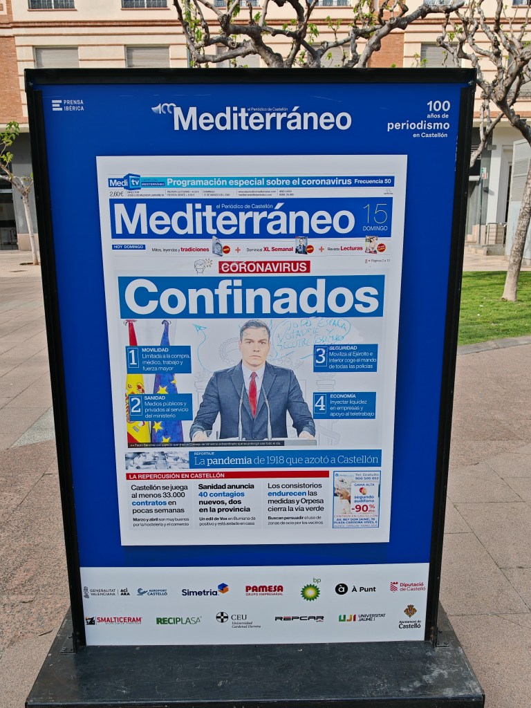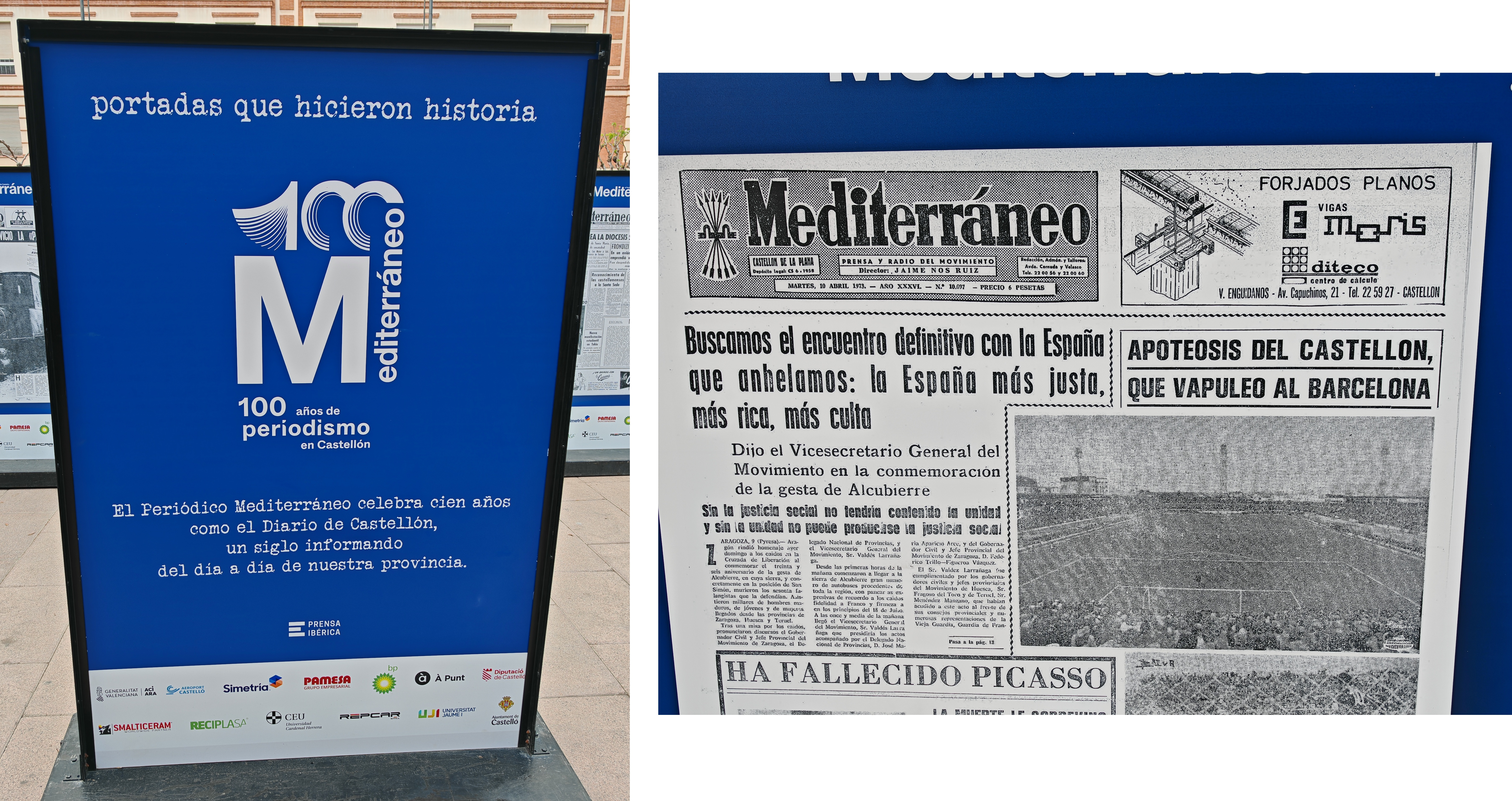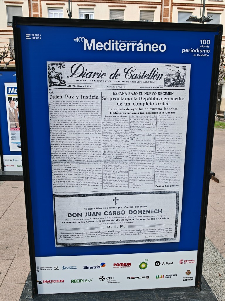 El pasado mes de abril pude disfrutar de esta espléndida exposición situada en la plaza Huerto Sogueros de Castellón, que conmemora los 100 años de vida del Periódico Mediterráneo. 55 portadas que van de 1925 a la actualidad en cuya selección se han elegido hechos sumamente relevantes para la historia de España y de la provincia. Organizada por la Diputación de Castellón, el propio periódico, el Ayuntamiento de Castelló y la Universidad Jaume I, además de otros entes privados.